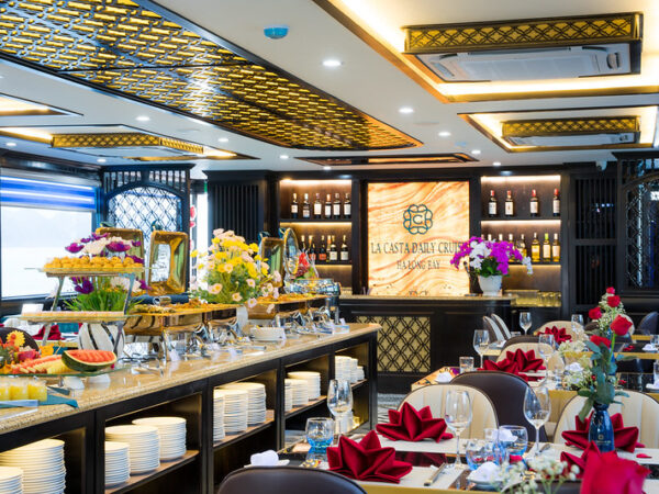 | 10:00: Upon arrival at Tuan Chau harbor, you will check-in and get on board the cruise then start a trip to discover the World Heritage. 10:30: Enjoy a welcome drink. The cruise departs from Tuan Chau harbor for a joyful journey to discover the beauty of the world heritage Ha Long Bay. Along the way, you will have a chance to pass through the grandeur of the legendary bay with thousands of limestone islands such as: Dog Rock, Duck Rock and especially Thumb Rock – a beautiful limestone islet rising from sea water in the shape of a giant thumb. Mother Nature has put Thumb Rock here to send a message of goodness to every passenger cruising in the ancient bay. 12:00: Have a huge buffet lunch with a variety of dishes including seafood and Vietnamese traditional food. 13:00: Stop at Bo Hon Island. Our tour guide will take you to Sung Sot Cave/Surprising Cave, the largest and the most beautiful cave in Halong Bay. After about 200 steps under the forest canopy, the entrance of the cave shows up. A paradise appears in front of you. You will discover the cave in about 45 minutes before getting back to the cruise (For other tourists who can’t walk much, you can stay on cruise, chilling out on the sundeck). 14:00: Say goodbye to Sung Sot Cave, cruise heads to Luon Cave. In this area, it’s time for you to heat up with kayaking (about 30 minutes kayaking) 15:00: Stop at Titov Island. On this small island, you can climb halfway up the mountain to enjoy a panoramic view of HaLong Bay. Looking down from high above gives you a wonderful sensation; at the same time offers you a spectacular view of every corner of the bay. 16:00: After that, you will get back to cruise and ready for our Sunset Party. Vietnamese tea, fresh fruits and snacks will be served when you’re relaxing on the sundeck or in the Jacuzzi. On the way back, the cruise will pass by Hoa Cuong area, one of the most beautiful spots in the bay. 17:30-18:00: Arrive in Tuan Chau port. End of the trip. Thank you for choosing La Casta Daily Cruise for your holiday in Vietnam. See you on the next journey! PRICE FOR PER CABIN FROM 53USD |