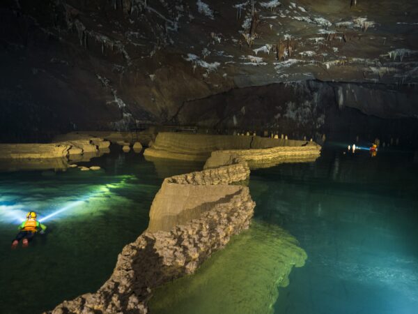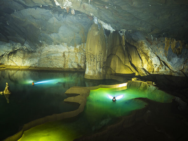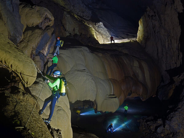 From the trailhead, we will enter the jungle and hike to the entrance of Hang Nuoc Nut. Here we put on our Petzl helmets and Hope Technology 1500 lumen head lamps. Once inside the low opening, the cave enlarges dramatically and we explore the high-level series with excellent photographic opportunities. We have a picnic lunch with ice cold drinks provided before setting off in the cave for around 2 km. Enjoy the beautiful formations, enormous passage and underground river, again with many photographic opportunities.