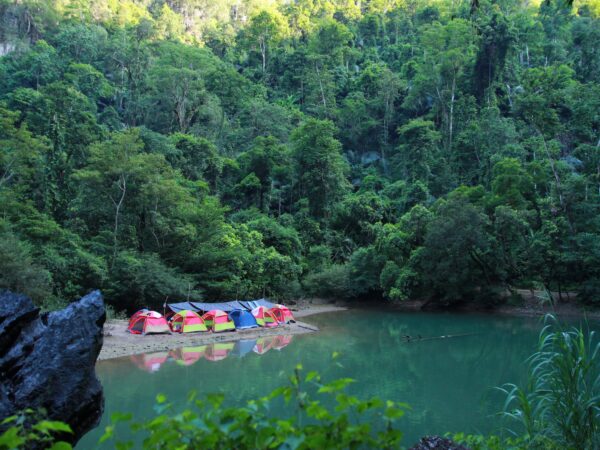 Lunch will be enjoyed in the Hung Ton Cave opening and then the adventure picks up again with some serious trekking from Hung Ton Valley and over to Mango Mountain, then back down into Tu Lan Valley (3 km). By midafternoon, Tu Lan campsite will be on the horizon, where swimming can be enjoyed in the beautiful waterfall. Afternoon activities include exploring and swimming through Ken Cave, located next to the campsite, and after that it’s back to camp for a delicious BBQ dinner. Sleep will come easy in comfortable hammocks or tents set up amongst the trees.